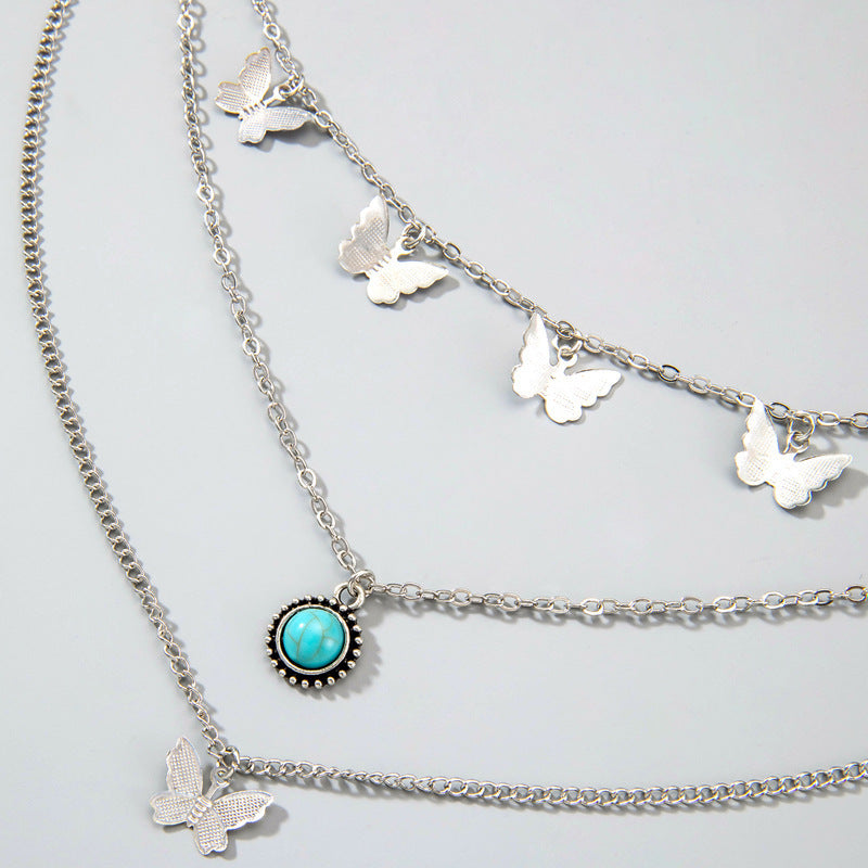Ornament Retro Ethnic Style Simple Alloy Tassel Butterfly Inlaid Turquoise Multi-layer Necklace For Women