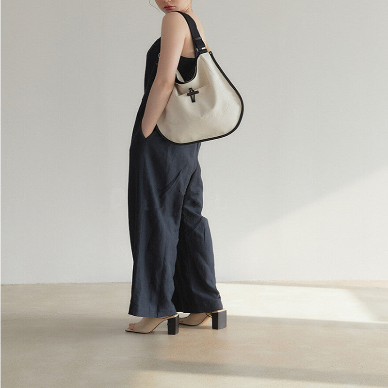 Contrast Color Texture Drawstring Tote Large Capacity Canvas Stitching Leather Simple Bag