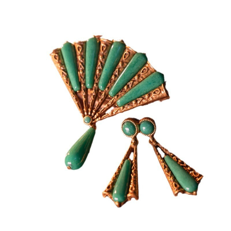 Medieval Retro Grandmother Green Stone Fan-shaped Brooch 925 Stud Earrings Suit