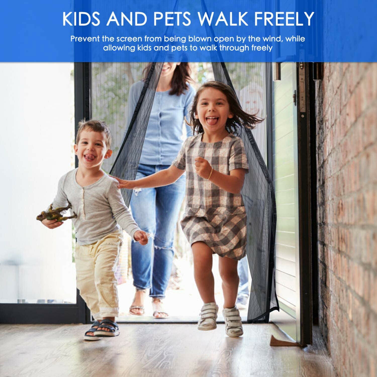 Los niños y las mascotas pasan y la pantalla se cierra detrás de ellos.