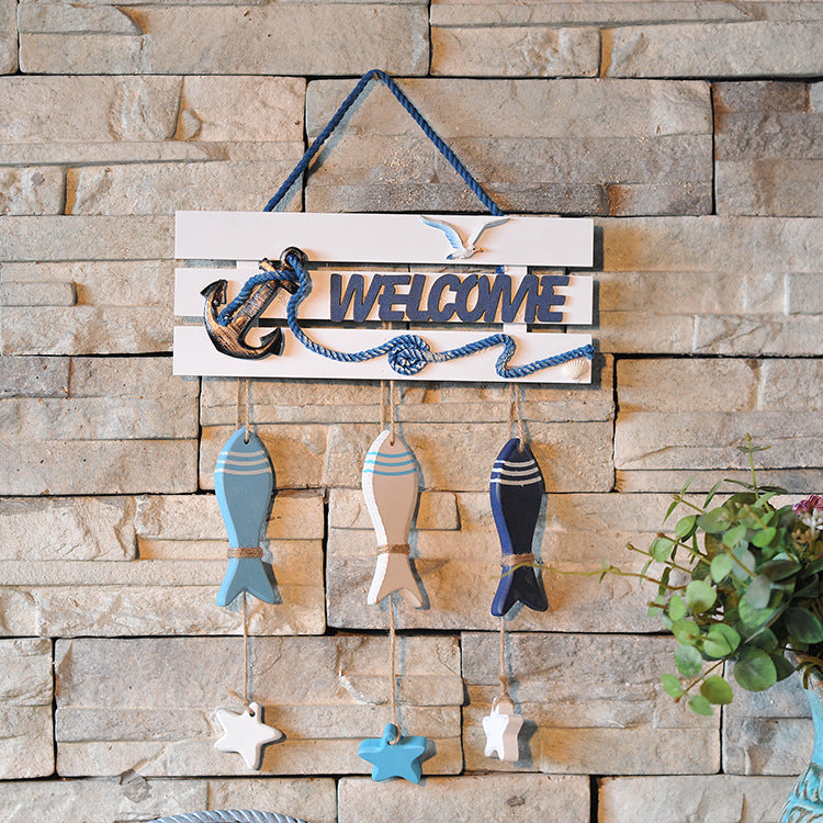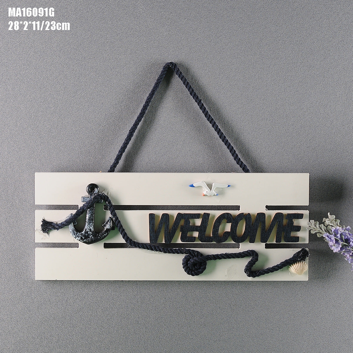 Placa de bienvenida mediterránea, adorno marino, timonel, ancla de mar, barra de bienvenida, placa de bienvenida de madera 16091