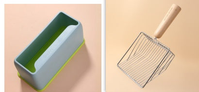 Color: base rosa, base gris, base azul claro, pala de arena para gatos de metal con mango de madera.