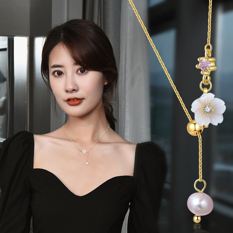 Cadena de clavícula ajustable con borla de flores de concha de perla natural para mujer