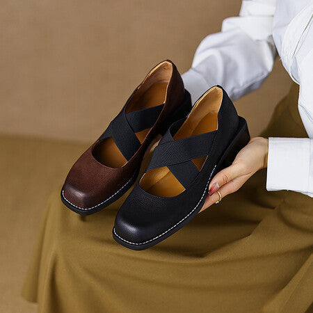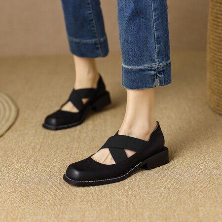 Bombas de boca baja con cinturón elástico de tacón bajo retro de piel de vaca