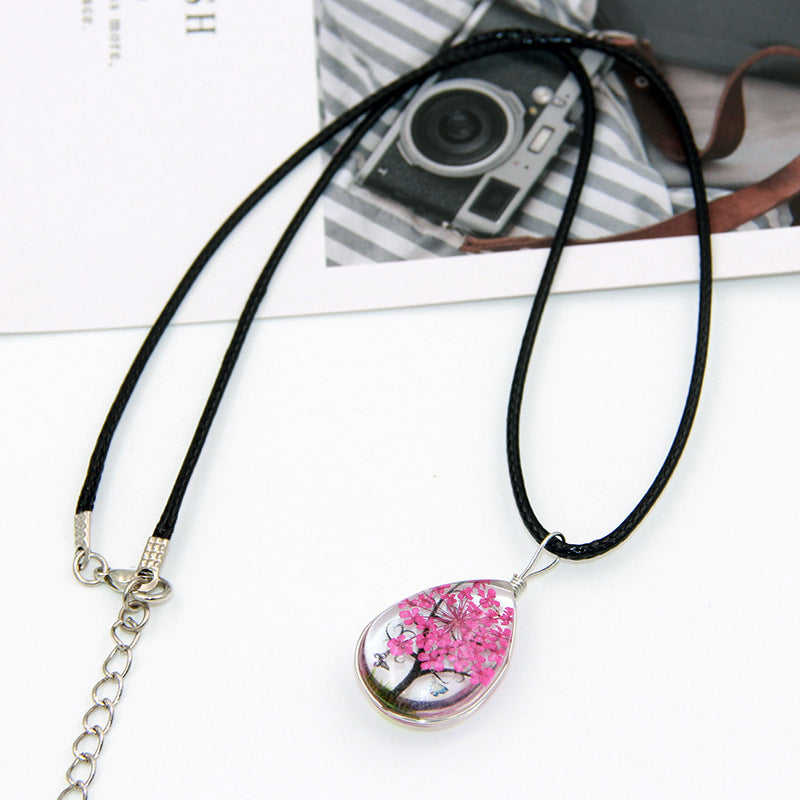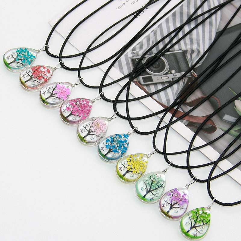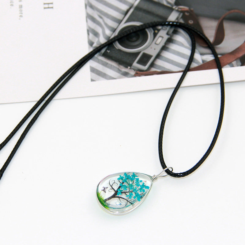 Collar de cadena de cuero con flores secas para niña Mori, diente de león, trébol de cuatro hojas, árbol de la suerte hecho a mano