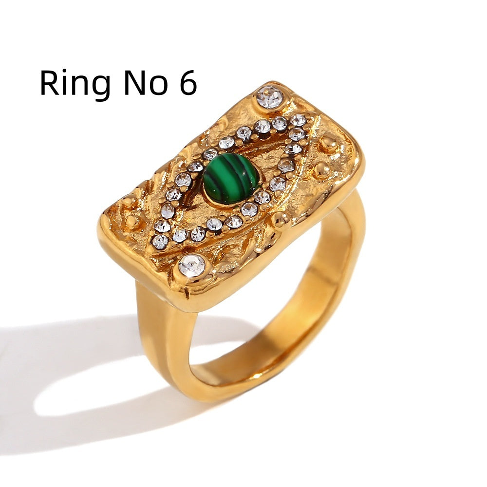 Color: pulsera abierta de diamantes de imitación con patrón de ojo de malaquita, oro, aretes en forma de C de diamantes de imitación con patrón de ojo de malaquita, oro, collar con colgante de placa cuadrada de diamantes de imitación de circonio de ojo de malaquita, oro, anillo de placa cuadrada de diamantes de imitación de circonio de ojo de malaquita, dorado-No.6, malaquita Anillo con placa cuadrada de diamantes de imitación y circonitas con ojos-Dorado-No.7, anillo con placa cuadrada de diamantes de imitación y circonitas con ojos de malaquita-Dorado-No8