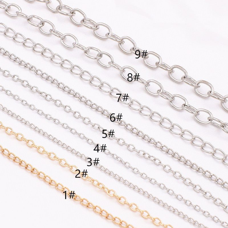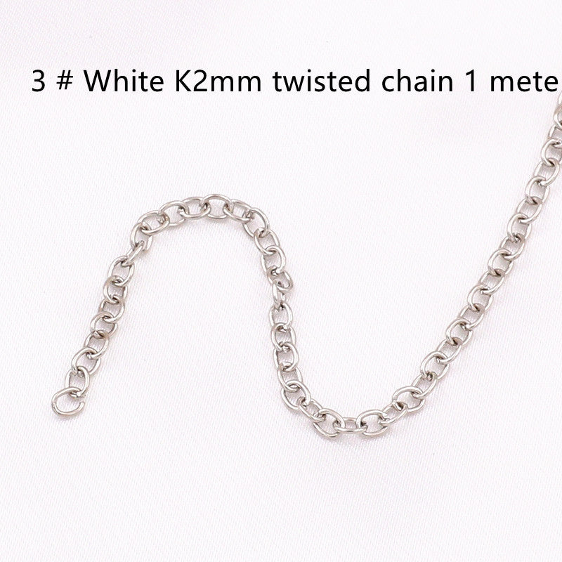 Color: 1# KC cadena torcida de oro de 3 mm de 1 metro, 2# KC cadena de oro de 3 mm de 1 metro, 3# cadena torcida blanca de K2 mm de 1 metro, 4# cadena blanca de K de 2 mm de 1 metro, 5# cadena blanca de K de 3 mm de 1 m , 6# Cadena retorcida blanca K3mm 1 m, 7# Cadena retorcida blanca K5.5mm 1 m, 8# Cadena blanca K 7mm o 1 m, 9# Cadena blanca K 8mm o 1 m