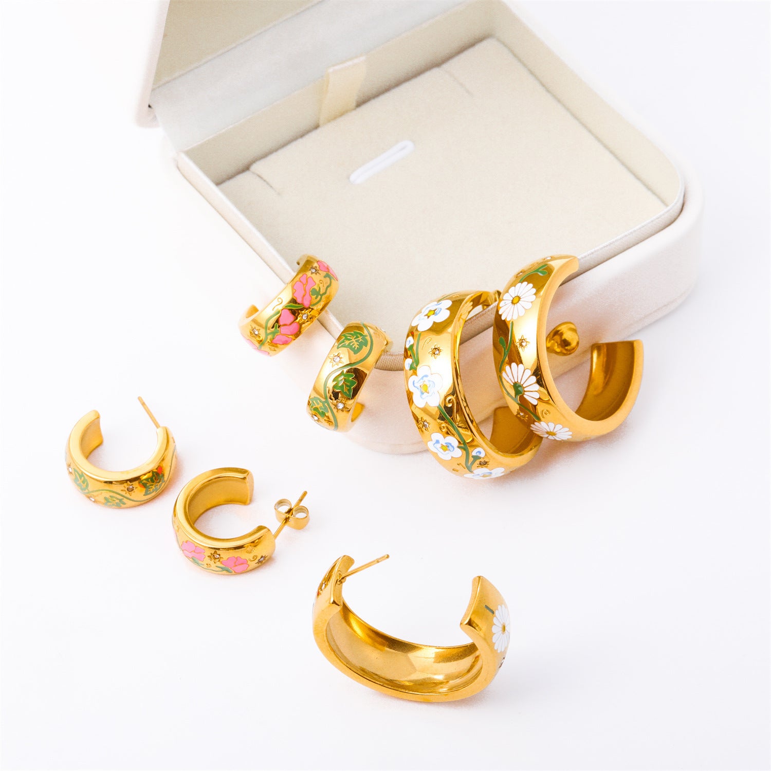 Pendientes en forma de C con flor pintada y rosa