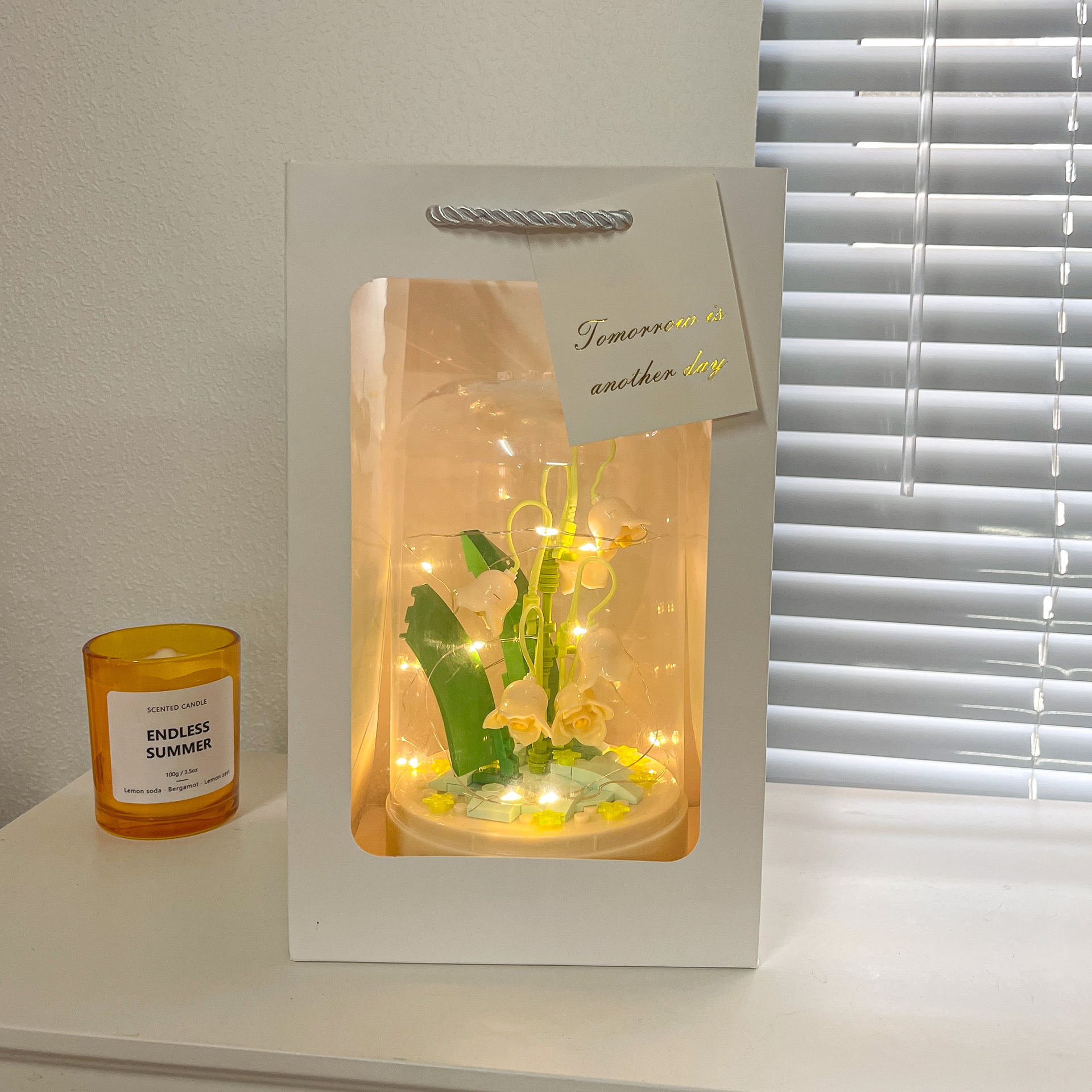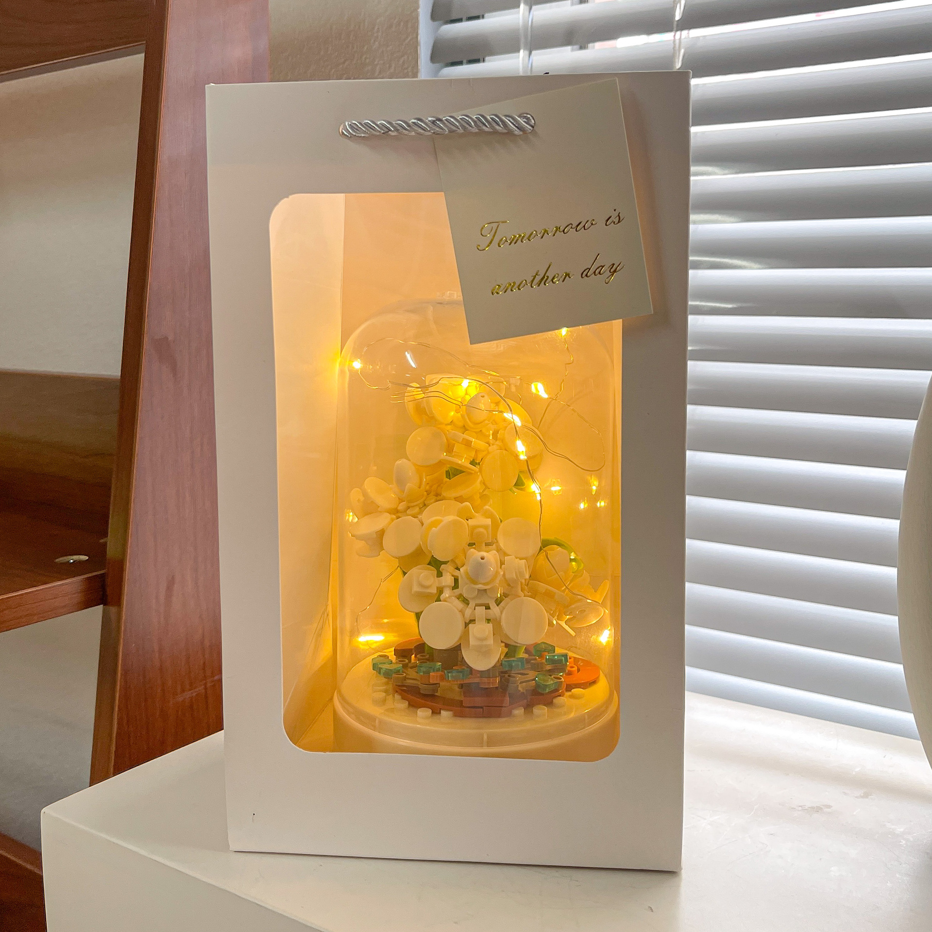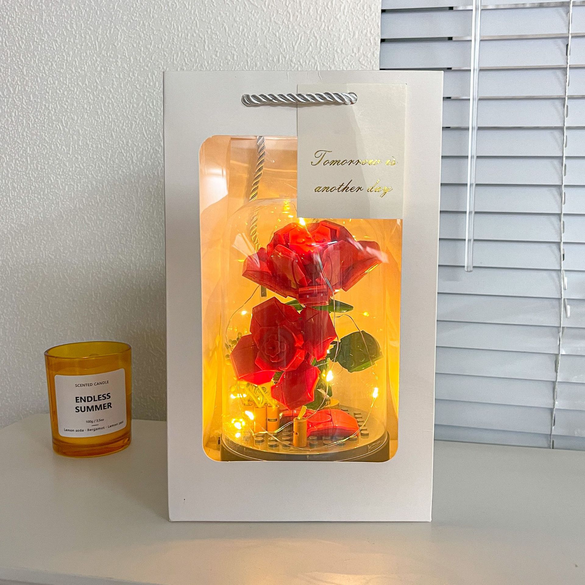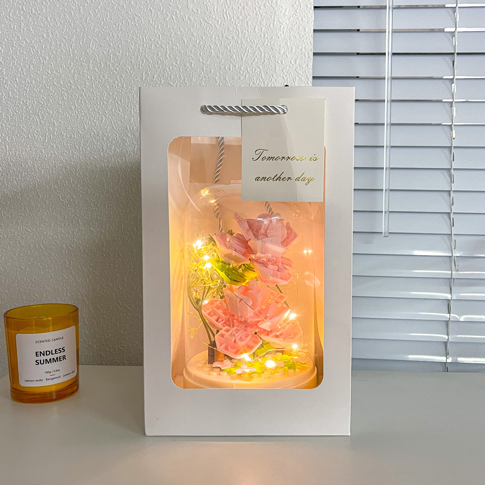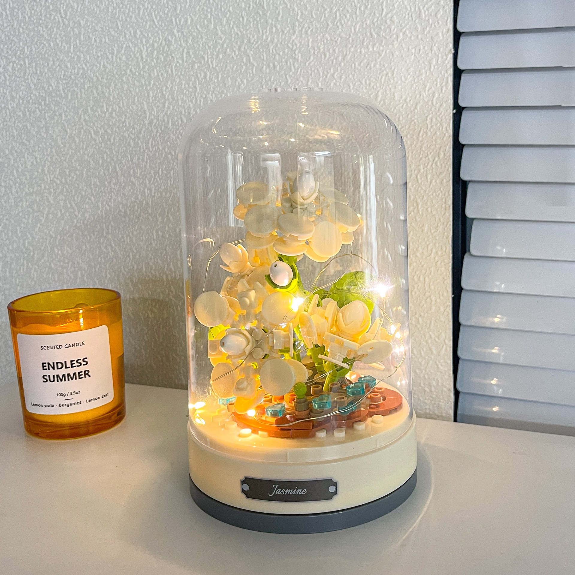 Caja de música ensamblada con flor de jazmín y bloque de construcción de flor eterna rosa