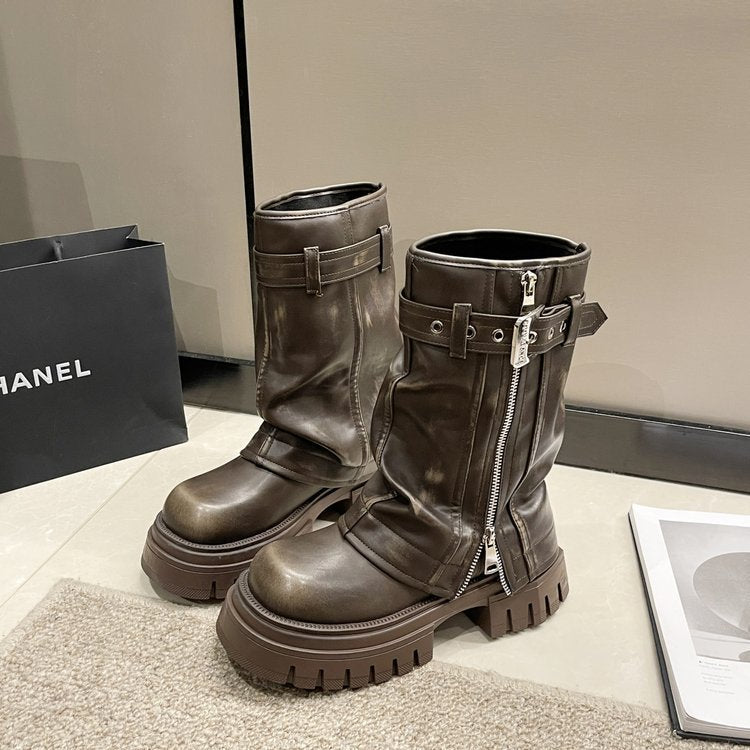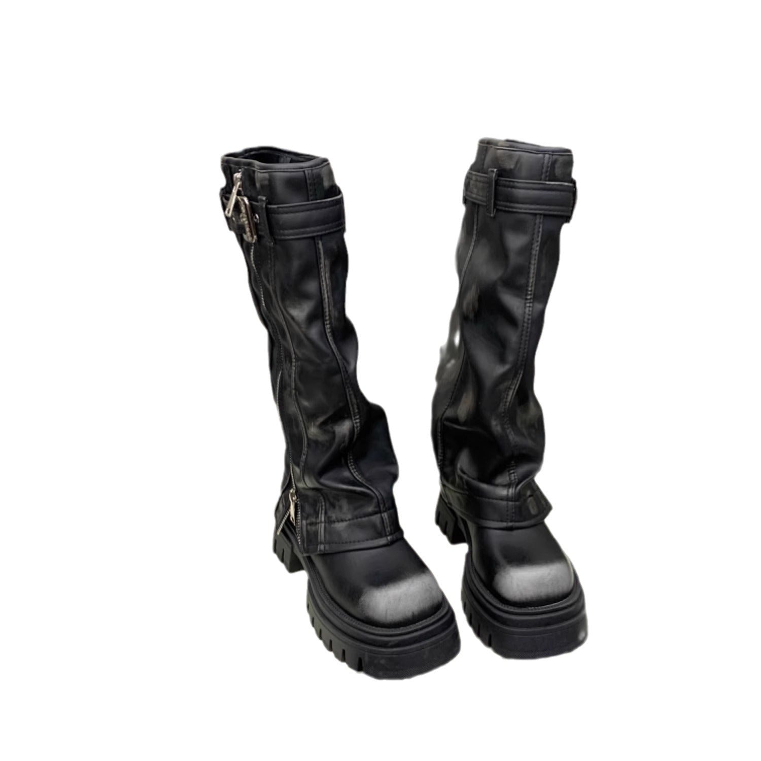Genuine Leather Slip On Heavy Industry Zipper High-top Pantyhose Boots