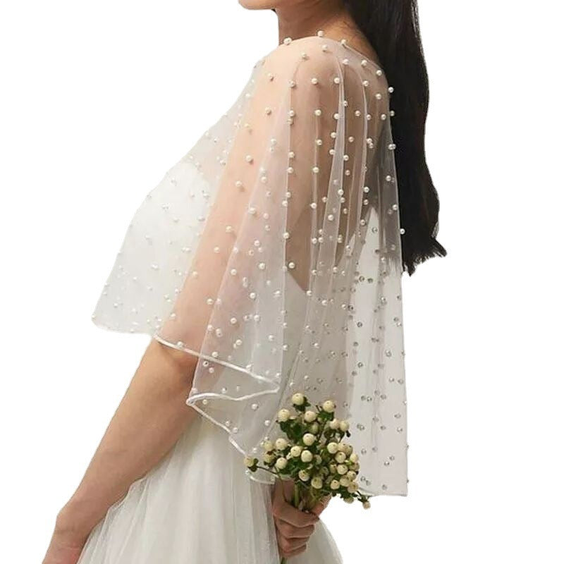 Châle court en gaze uni avec bord verrouillé et perles, blanc ivoire