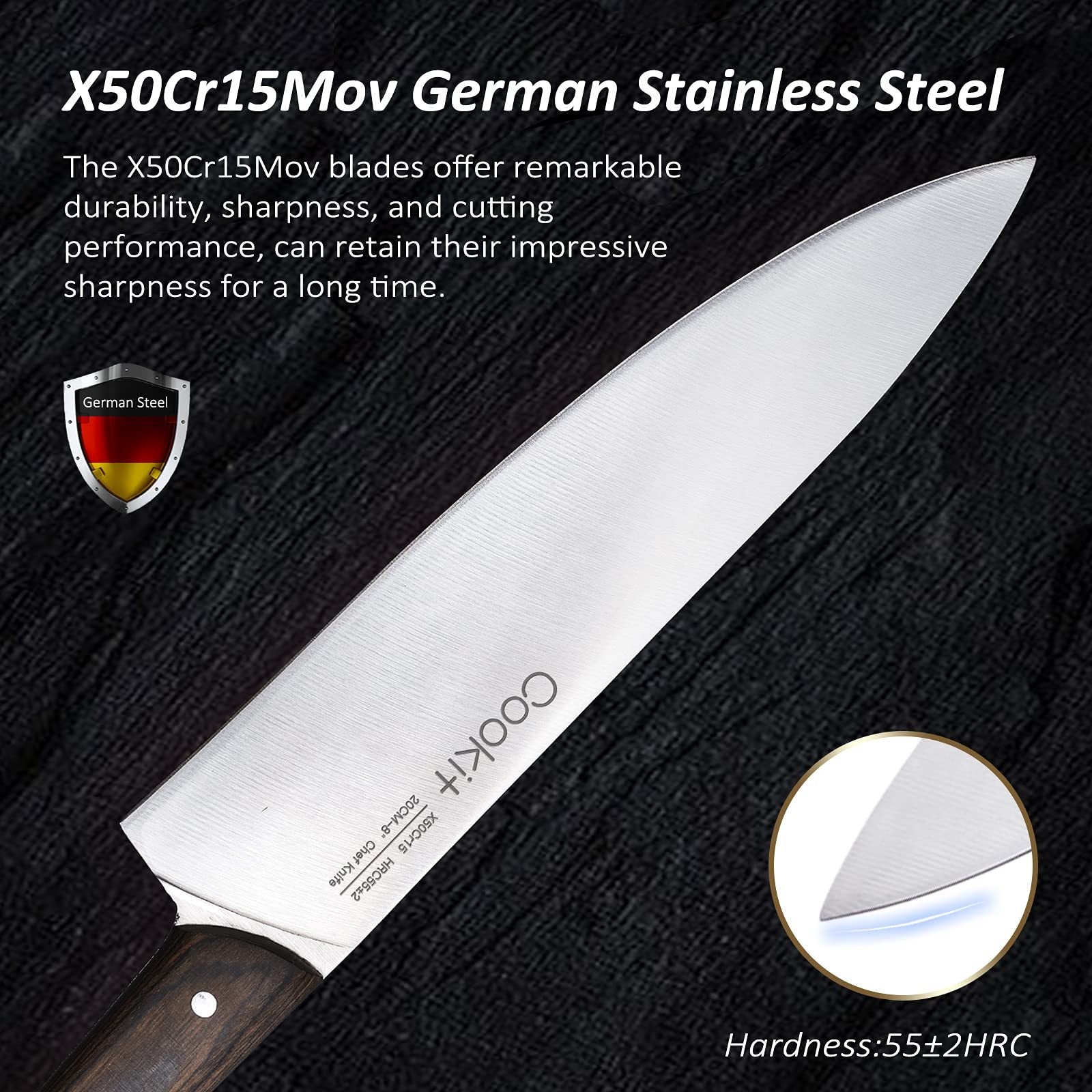 • Ensemble de 9 couteaux de cuisine forgés en acier inoxydable allemand X50CrMoV15, qui est plus résistant que l'acier à couteaux normal et reste tranchant, antirouille, résistant à la corrosion et facile à nettoyer.