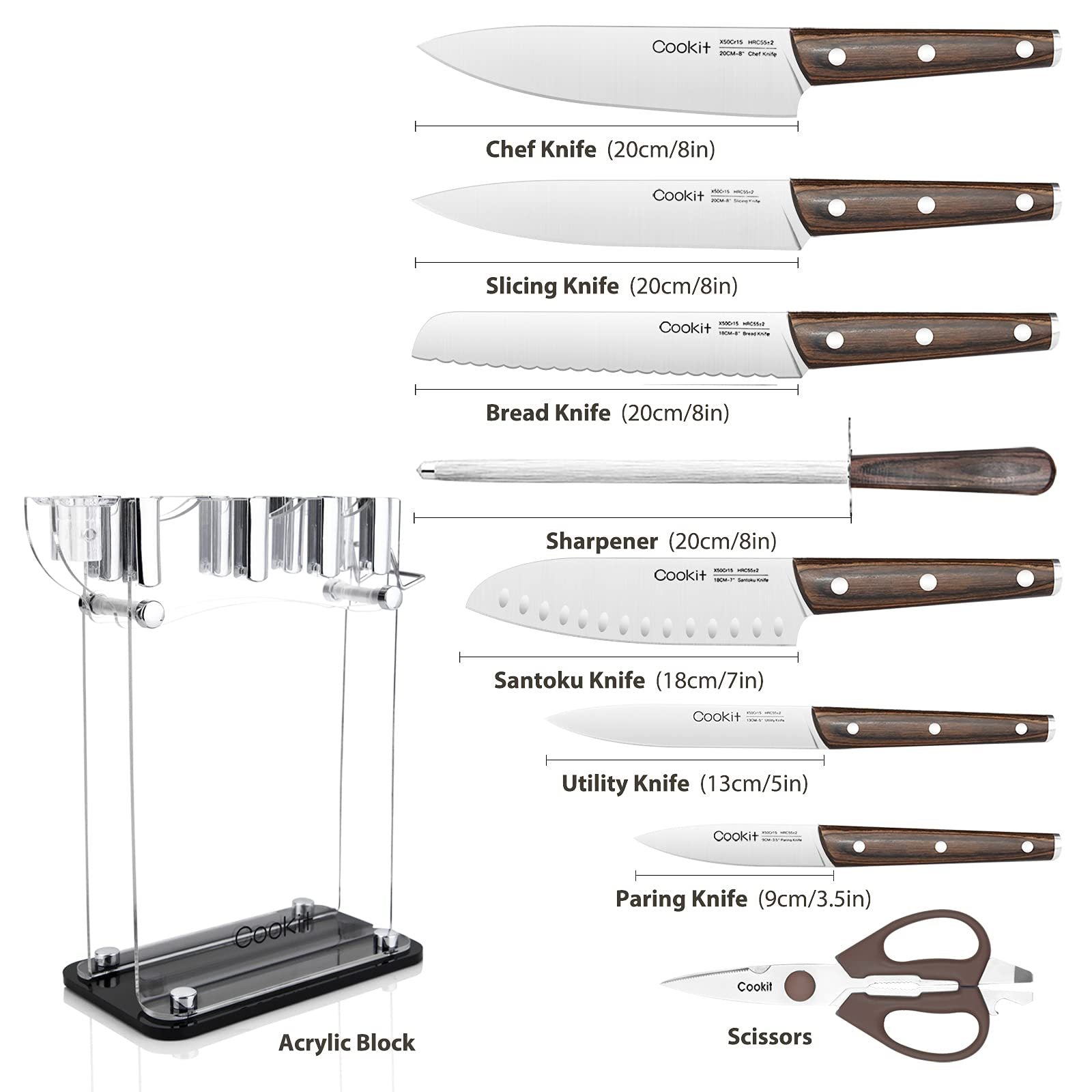 Bloc à couteaux avec couteau, ensemble de 9 couteaux de cuisine tranchants avec support de bloc en acrylique, manche en bois avec aiguiseur manuel, ciseaux à éplucher - Meilleur ensemble de couverts cadeau Plateforme Amazon