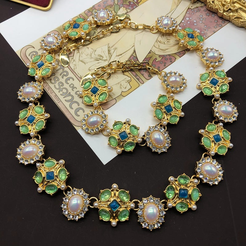 Flower Gem Diamond Necklace Bracelet Ear Studs Gold Plated Suit