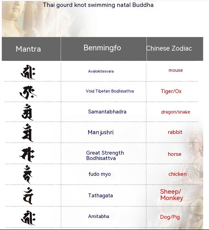 Couleur: Kwan-yin à mille mains de 8 mm (RAT), Tibétain vide de 8 mm (bœuf et tigre), Bodhisattva Manshu de 8 mm (lapin), Bodhisattva Puxian de 8 mm (serpent dragon), Mahasthamaprapta de 8 mm (cheval), Vairocana de 8 mm (singe de mouton), Acalanatha (poulet) de 8 mm, Bouddha Amitabha de 8 mm (chien cochon), Kwan-yin aux mille mains de 10 mm (RAT), Tibétain vide de 10 mm (bétail et tigre), Manjusa (lapin) de 10 mm, Bodhisattva Puxian (serpent dragon) de 10 mm, Mahasthamaprapta de 10 mm (cheval), Vairocana (singe mouton) 10 mm, acalanatha (poulet) 10 mm, Bouddha Amitabha 10 mm (chien cochon)